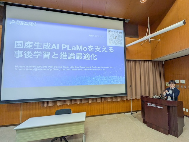 Under the title of “Post-Training and Inference Optimization Supporting the Domestic Generative AI ‘PLaMo’”, they introduced recent works in their company on how to build large language models, with a focus on post-training and decoding.